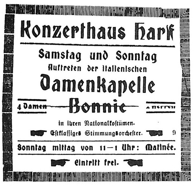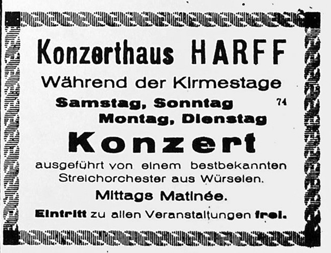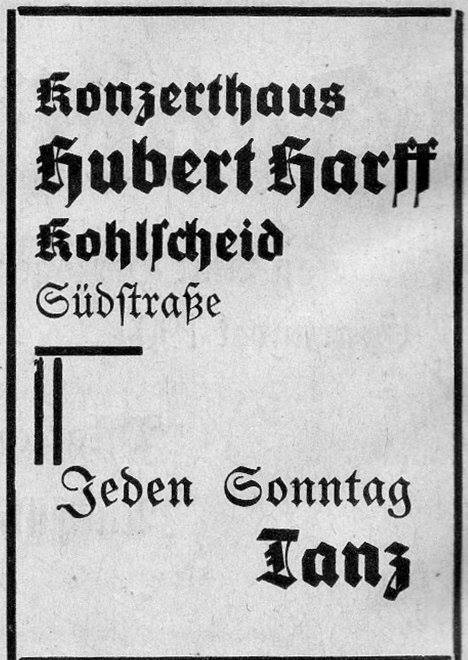 Am 29. September 1919 wurde das „Konzerthaus Harff“ von Hubert Harff als Gaststätte eröffnet und in den Jahren 1924 und 1928 durch Anbauten (vermutlich unter Einbeziehung benachbarter Häuser) erweitert. Schon früh bot das Lokal regelmäßig Tanz und Kulturveranstaltungen an: